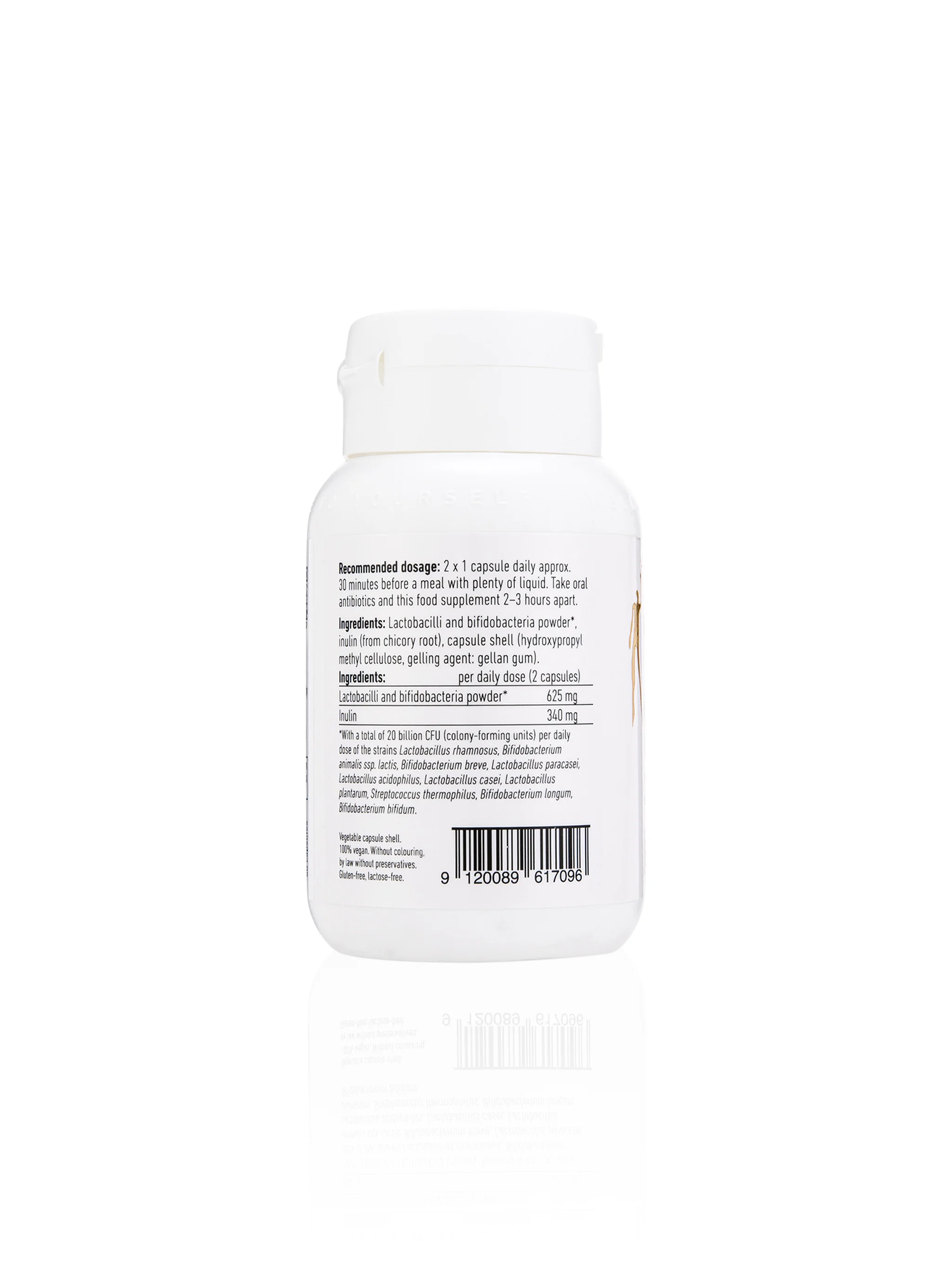Premium synbiotic with 10 scientifically tested bacterial strains (20 billion CFUs) and prebiotic inulin for comprehensive gut flora balance and digestive health.