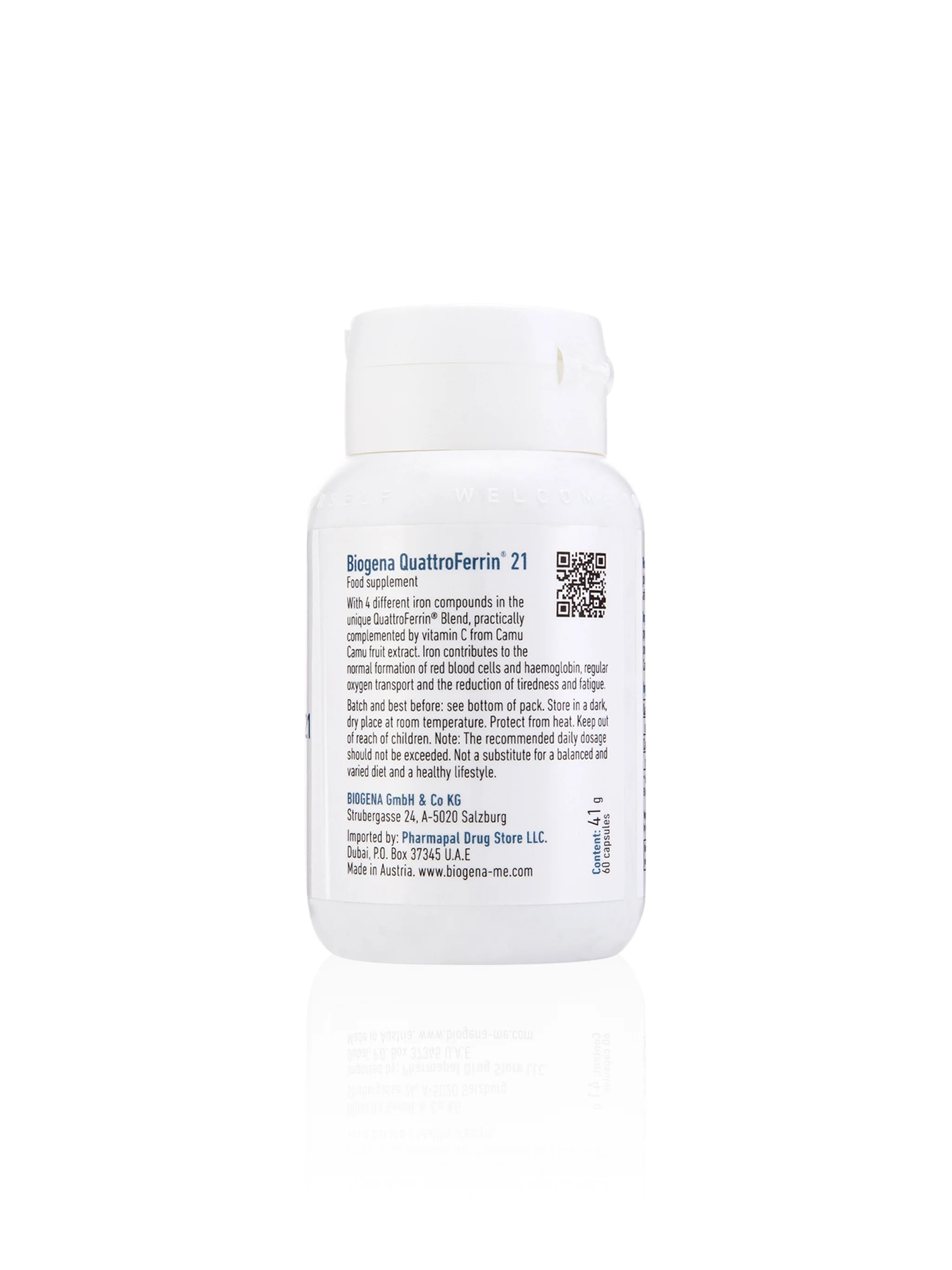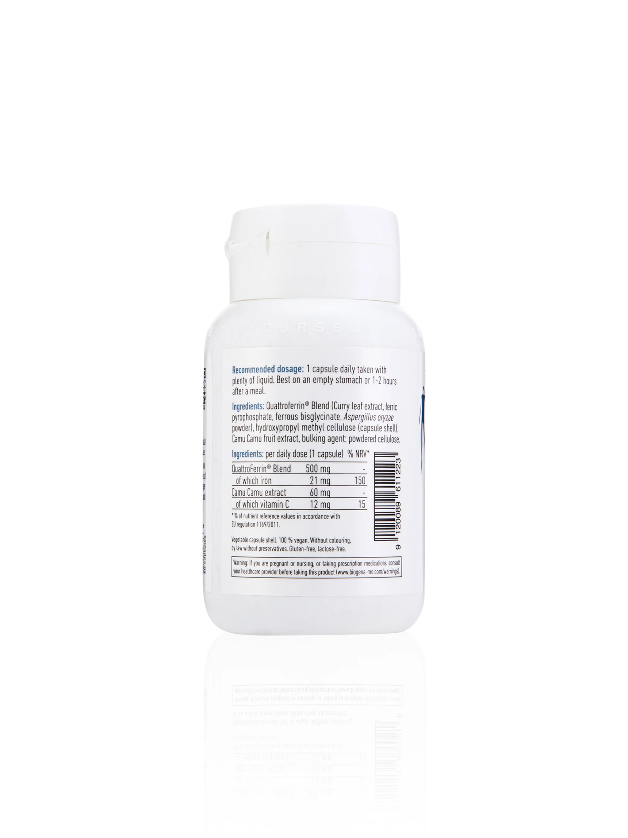 Biogena QuattroFerrin® 21 is an innovative iron preparation designed for optimal absorption, effectiveness, and gentle digestion. This premium formula features the unique QuattroFerrin® blend, which combines four distinct iron compounds that utilize different absorption pathways in the body: plant-based iron from Curry Leaf extract and Koji Mushroom (fermented with iron), alongside highly bioavailable organic Iron Bisglycinate and well-tolerated Iron Pyrophosphate.