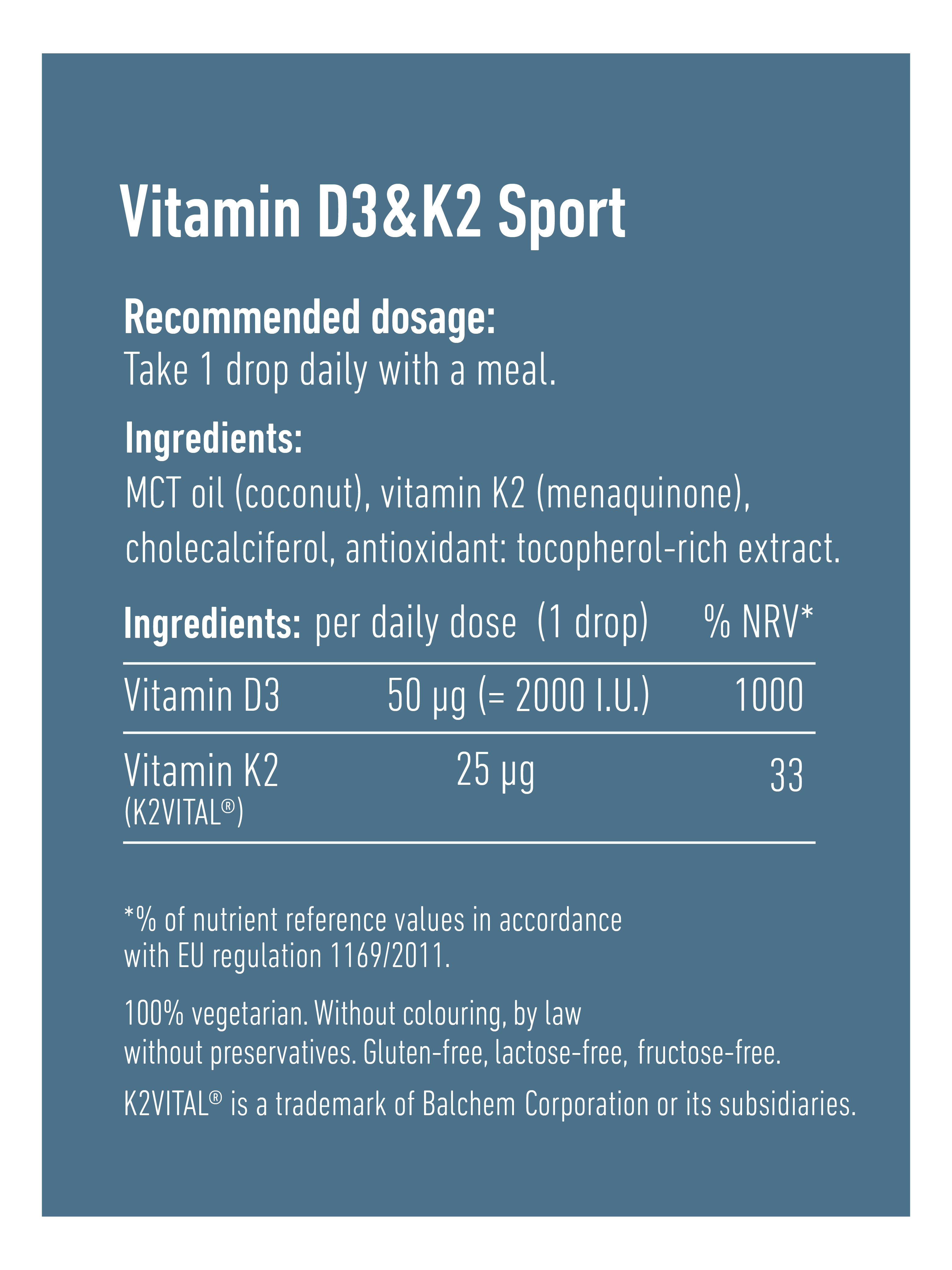 BIOGENA SPORTS D3 & K2 liquid provides the perfect vitamin partnership for athletes in convenient drop form. Each drop delivers 2000 IU of Vitamin D3 plus 25µg of highly effective K2 MK-7, dissolved in MCT oil for superior absorption.